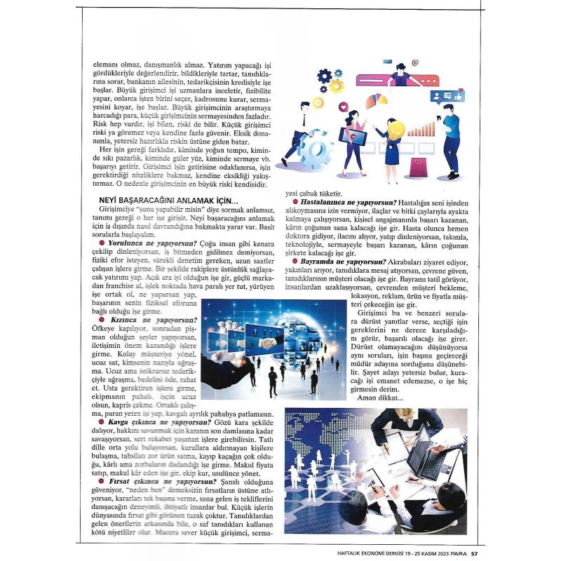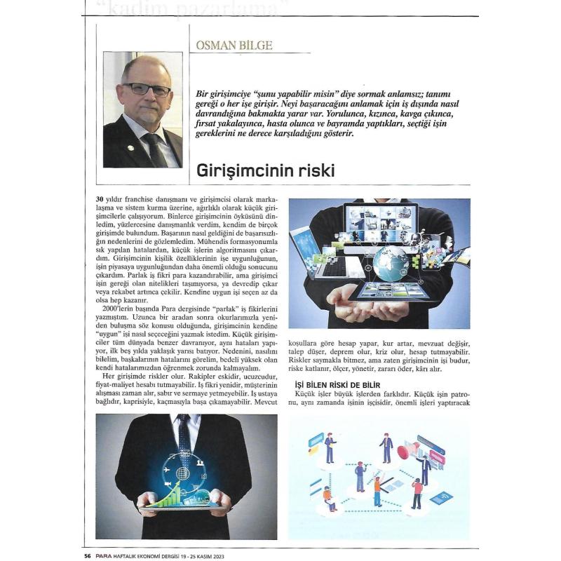 2000’lerin başında Para dergisinde “parlak” iş fikirlerini yazmıştım. Uzunca bir aradan sonra okurlarımızla yeniden buluşma söz konusu olduğunda, girişimcinin kendine “uygun” işi nasıl seçeceğini yazmak istedim. Küçük girişimciler tüm dünyada benzer davranıyor, aynı hataları yapıyor, ilk 5 yılda yaklaşık yarısı batıyor. Nedenini, nasılını bilelim, başkalarının hatalarını görelim, bedeli yüksek olan kendi hatalarımızdan öğrenmek zorunda kalmayalım.