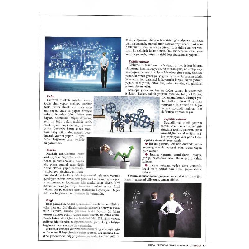 Girişimci iş hayatında yapacağı stratejik, taktik, lojistik yatırımlarını baştan planlamalı. Strateji, hangi hedefe, hangi kaynakları kullanarak, hangi yöntemle varacağını tanımlamaktır. Girişimci iş hayatının başındayken, farklı pazarları, iş dünyasının kurallarını, kendi kapasitesini ve sınırlarını iyi bilemeyebilir, stratejik düşünemeyebilir. Stratejik yatırım dört şeye yapılır. Örneklerle açalım.
