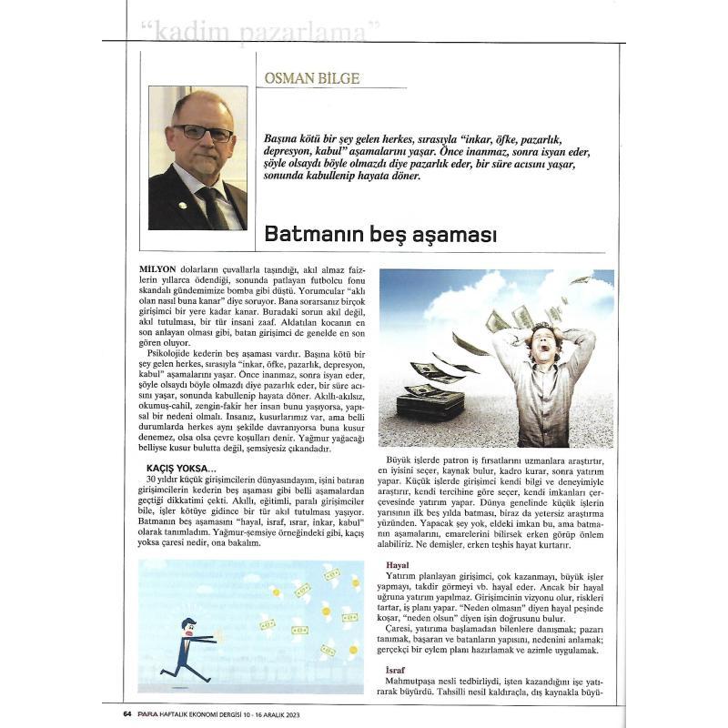 30 yıldır küçük girişimcilerin dünyasındayım, işini batıran girişimcilerin kederin beş aşaması gibi belli aşamalardan geçtiği dikkatimi çekti. Akıllı, eğitimli, paralı girişimciler bile, işler kötüye gidince bir tür akıl tutulması yaşıyor. Batmanın beş aşamasını “hayal, israf, ısrar, inkar, kabul” olarak tanımladım. Yağmur-şemsiye örneğindeki gibi, kaçış yoksa çaresi nedir, ona bakalım.