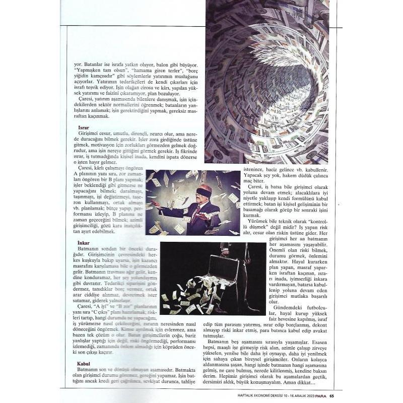 Yürümek bile teknik olarak “kontrollü düşmek” değil midir? İş yapan risk alır, cesur olan riskin üstüne gider. Her girişimci her an batmanın her aşamasını yaşayabilir. Önemli olan riski bilmek, durumu görmek, önlemini almaktır. Hayal kurarken plan yapan, masraf yaparken israftan kaçınan, ısrarı inada, iyimserliği inkara vardırmayan, batarsa kabullenip yoluna devam eden girişimci mutlaka başarılı olur.