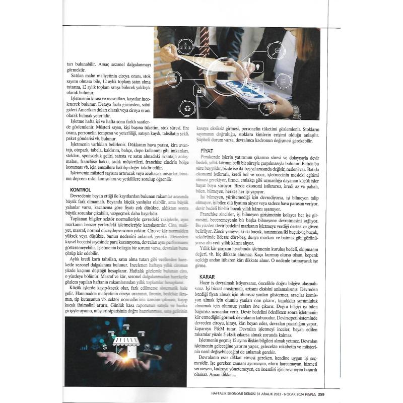 Devredenden işletmenin son 12 aylık cirosu, satın alma maliyeti, masrafları, personeli, kirası vb. yazılı olarak alınır. Sektör normallerine ve görünen performansa bakılıp kabaca değerlendirilir.