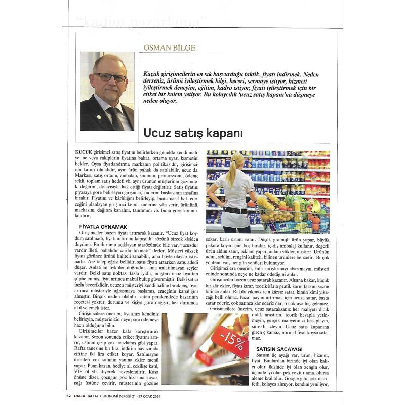 Küçük girişimcilerin en sık başvurduğu taktik, fiyatı indirmek. Neden derseniz, ürünü iyileştirmek bilgi, beceri, sermaye istiyor, hizmeti iyileştirmek deneyim, eğitim, kadro istiyor, fiyatı iyileştirmek için bir etiket bir kalem yetiyor. İşte bu kolaycılık “ucuz satış kapanı”na düşmeye neden oluyor. Bu kapana giren çıkamıyor.