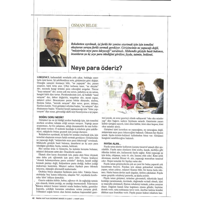 Rekabetten sıyrılmak, işi farklı bir zemine oturtmak için, işin temelini oluşturan soruyu farklı sormak gerekiyor. Girişimcinin ne yapacağı değil, “müşterinin neye para ödeyeceği” sorulmalı. Mühendis gözüyle basit bakınca, insanların şu üç şeye para ödediğini gördüm; fayda, tatmin, beklenti.