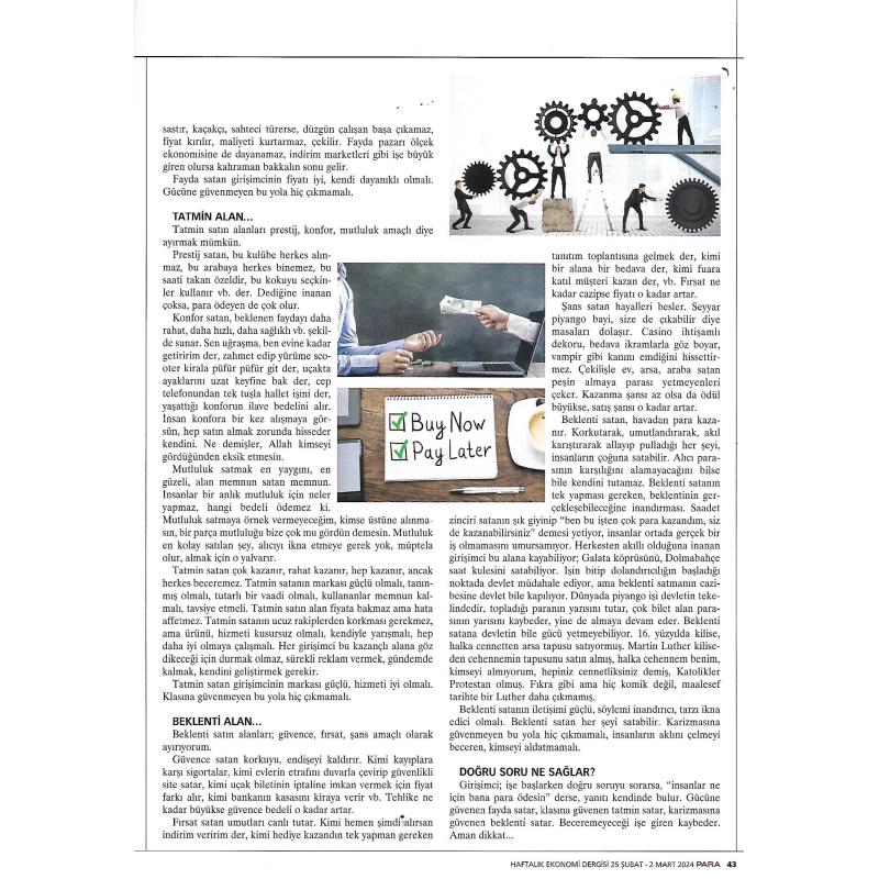 Girişimci işe başlarken doğru soruyu sorarsa, “insanlar ne için bana para ödesin” derse, yanıtı kendinde bulur. Gücüne güvenen fayda satar, klasına güvenen tatmin satar, karizmasına güvenen beklenti satar. Beceremeyeceği işe giren kaybeder. Aman dikkat..