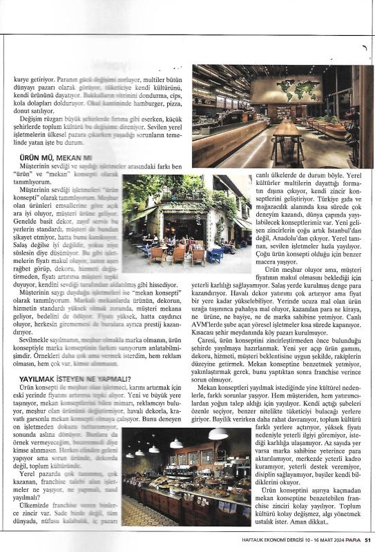 Ürün konsepti ile meşhur olan işletmeci, karını artırmak için eski yerinde fiyatını artırırsa tepki alıyor. Yeni ve büyük yere taşınıyor, mekan konseptlerini bilen mimarı, reklamcıyı buluyor, meşhur olan ürününü değiştirmiyor, havalı dekorla, kravatlı garsonla mekan konsepti olmaya çalışıyor. Bunu deneyen on işletmeden dokuzu tutturamıyor, aslına dönüyor. Bunlara da örnek vermeyeceğim, beceremedi diye kimse alınmasın. Herkes elinden geleni yapıyor ama sorun üründe, dekorda değil, toplum kültüründe.