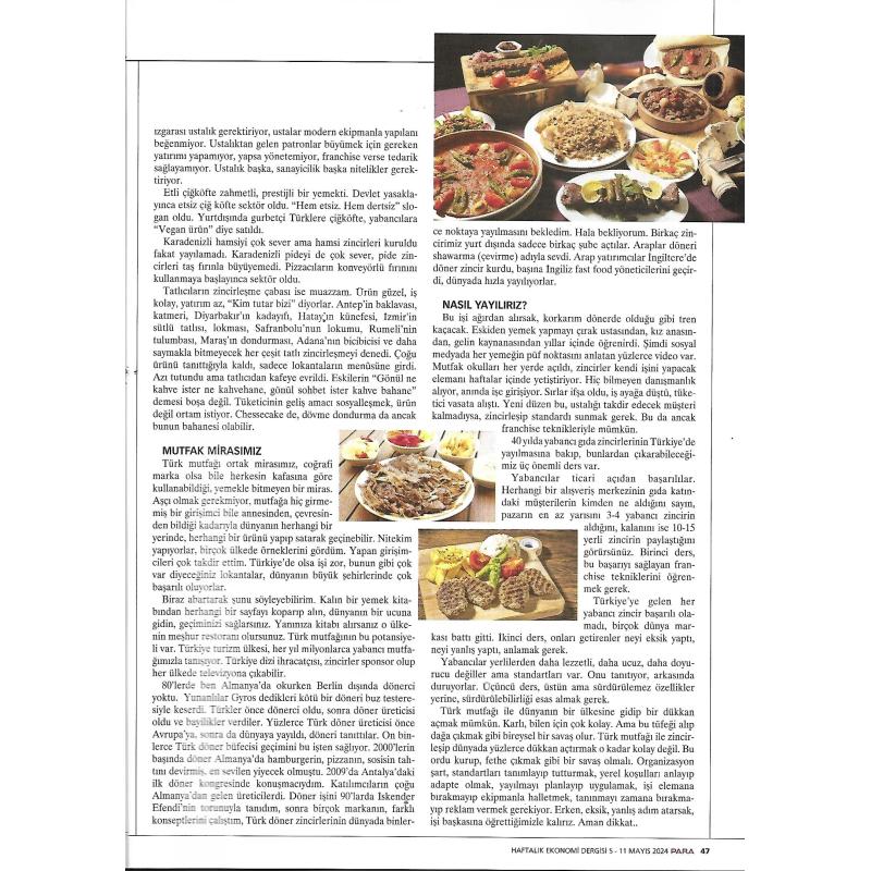 Türk mutfağı ile dünyanın bir ülkesine gidip bir dükkan açmak mümkün, karlı, bilene kolay. Ama bu tüfeği alıp dağa çıkmak gibi bireysel bir savaş olur. Türk mutfağı ile zincirleşip dünyada yüzlerce dükkan açtırmak o kadar kolay değil. Bu ordu kurup fethe çıkmak gibi bir savaş olmalı. Organizasyon şart, standartları tanımlayıp tutturmak, yerel koşulları anlayıp adapte olmak, yayılmayı planlayıp uygulamak, işi elemana bırakmayıp ekipmanla halletmek, tanınmayı zamana bırakmayıp reklam vermek gerekiyor. Erken, eksik, yanlış adım atarsak, işi başkasına öğrettiğimizle kalırız. Aman dikkat..